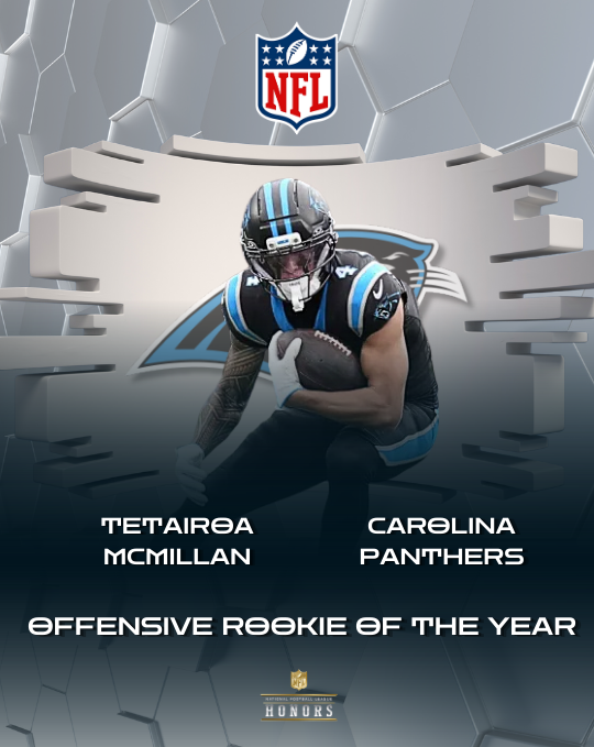 La notte degli NFL Honors 2026, tenutasi a San Francisco il 5 febbraio, ha consacrato una nuova stella nel firmamento del football americano. Tetairoa McMillan, ricevitore dei Carolina Panthers, è stato eletto Offensive Rookie of the Year (OROY) per la stagione 2025. La scelta n. 8 dell'ultimo draft ha riportato il premio a Charlotte quattordici anni dopo Cam Newton, confermandosi come il pezzo mancante dell'attacco guidato da Bryce Young. McMillan ha dominato la classe dei rookie fin dalle prime battute, raggiungendo le 100 yard già nella sua seconda partita in carriera. Ha chiuso la stagione regolare come leader assoluto tra i debuttanti in tutte le principali categorie statistiche per i ricevitori: 70 ricezioni (record per un rookie dei Panthers), 1.014 yards ricevute (unico rookie sopra quota mille nel 2025), 7 touchdown (1° tra i rookie). Il verdetto della giuria non ha lasciato spazio a dubbi. McMillan ha ottenuto ben 41 voti su 50 per il primo posto, accumulando un totale di 445 punti. Il distacco dai rivali è stato netto con il secondo posto occupato da Tyler Shough (New Orleans Saints) che ha ottenuto 168 punti. Nonostante le ottime stagioni dei quarterback Tyler Shough e Jaxson Dart, l'impatto esplosivo di McMillan sulla rinascita dei Panthers, tornati ai playoff per la prima volta dal 2017, è stato il fattore determinante per la vittoria finale. Accettando il premio sul palco, McMillan ha ringraziato l'organizzazione dei Panthers per aver creduto in lui come primo ricevitore puro. Con questo riconoscimento, il giovane talento si proietta verso la stagione 2026 come uno dei volti della nuova NFL, pronto a consolidare la sua intesa con Young e a riportare stabilmente Carolina tra le grandi della NFC.