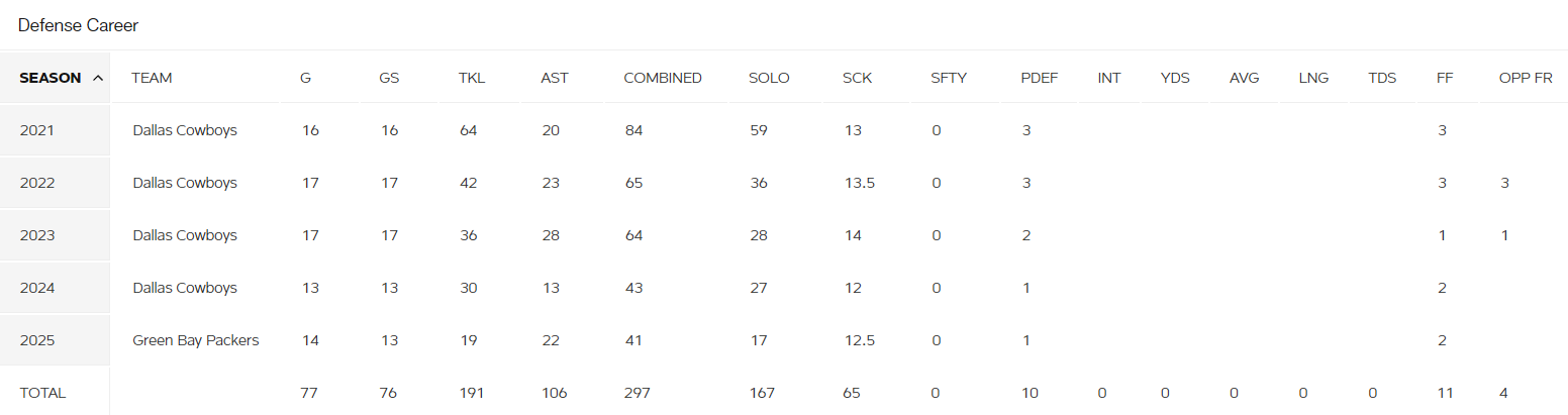 30/12/2025 - Ian Rapoport di NFL Network riferisce che si prevede un recupero di 9 mesi per il pass-rusher dei Green Bay Packers Micah Parsons (infortunio al ginocchio), stella della squadra, dopo l'intervento chirurgico al legamento crociato anteriore del ginocchio sinistro infortunato lunedì. Parsons ha subito l'infortunio che ha posto fine alla stagione nella sconfitta della Week 15 contro i Denver Broncos, quando è caduto goffamente sul ginocchio sinistro mentre attaccava il passatore. Si prevede che il 26enne salterà l'inizio della stagione 2026, ma tutto sommato è una buona notizia che Parsons abbia subito una lesione netta del legamento crociato anteriore e che non siano stati interessati altri legamenti. Il 5 volte Pro Bowler era sulla buona strada per raggiungere un nuovo record di sack prima dell'infortunio, chiudendo con 12,5 sack e 41 tackle totali in 14 partite nel suo primo anno a Green Bay. Parsons ha totalizzato almeno 12 sack in tutte e 5 le sue stagioni nella NFL.